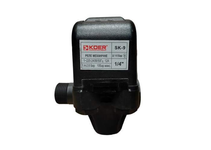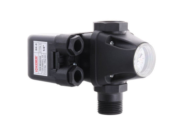 - Комплект Koer SK-9 виконаний в єдиному моноблочному корпусі, виготовленому з технополімеру і що має три різьбові виводи, з вбудованим реле та манометром