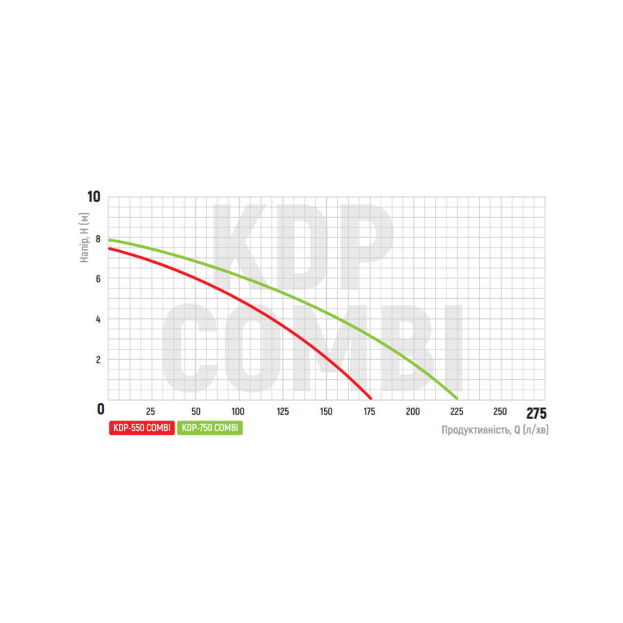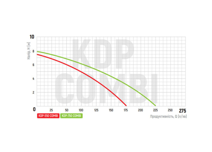 Н = 8 м, Q = 13,5 м3/год. (225 л/хв.), Р = 750 Вт, глибина занурення до 5 м, патрубок підключення шлангу з універсальною насадкою 1” – 1¼” – 1½”