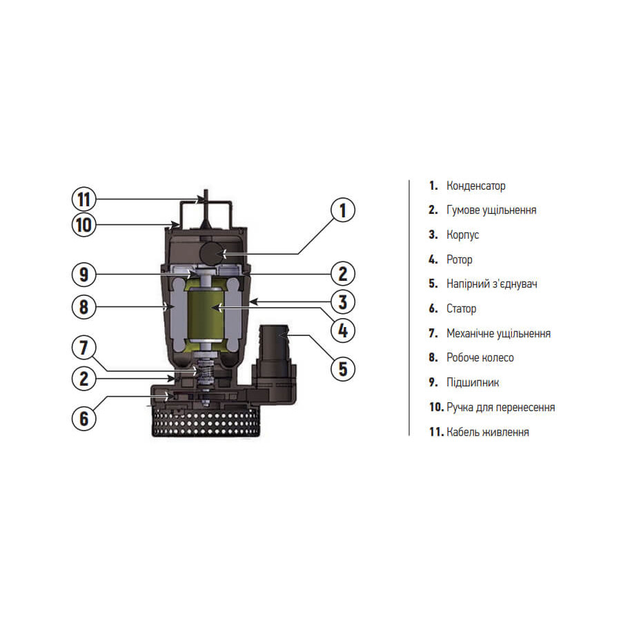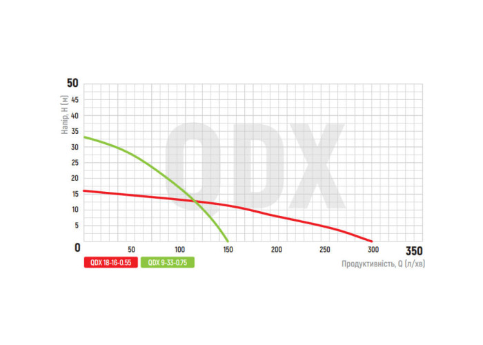 Н = 33 м, Q = 9 м3/год. (150 л/хв.), Р = 750 Вт, глибина занурення до 5 м, патрубок 1"