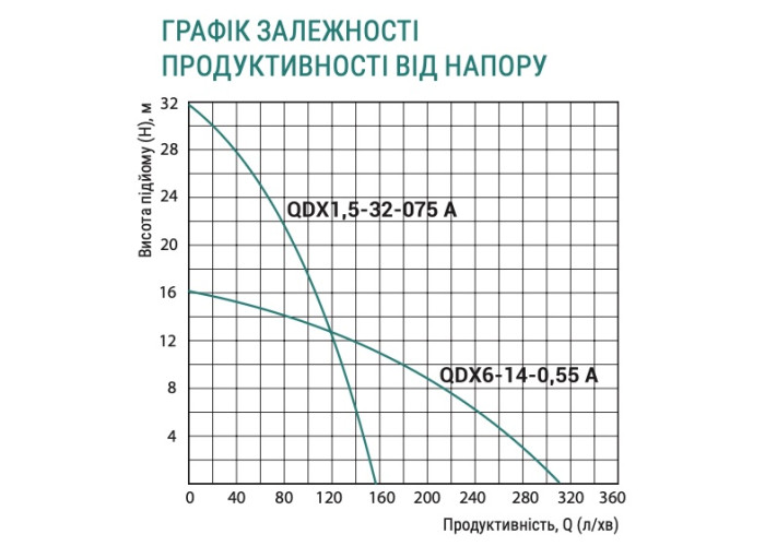 Н = 16 м, Q = 18 м3/год (300 л/хв.), Р = 550 Вт, глибина занурення до 5 м, патрубок підключення шланга 1½”, поплавковий вимикач