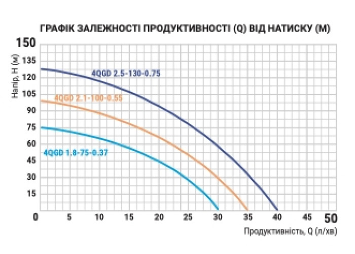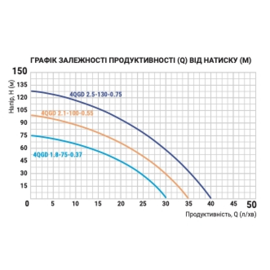 Н = 130 м, Q = 2,4 м3/год. (40 л/хв.), Р = 750 Вт, кабель 12 м