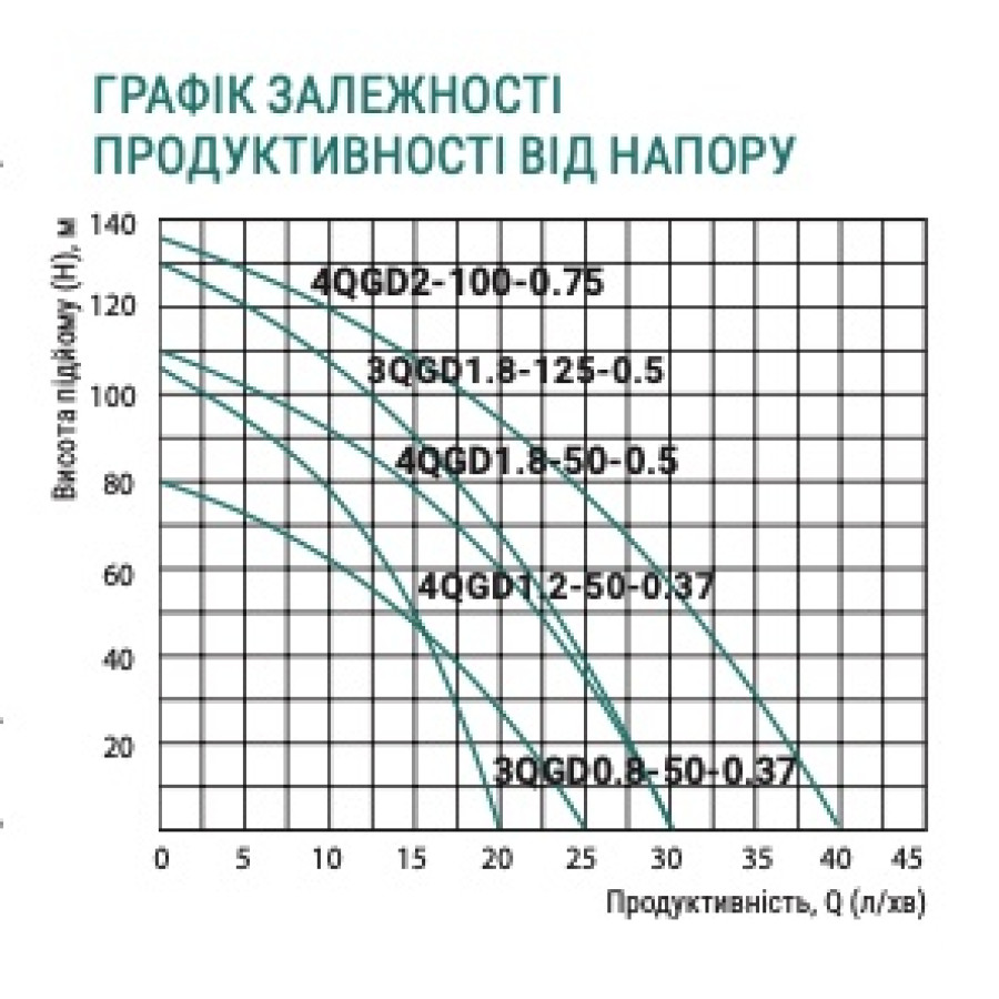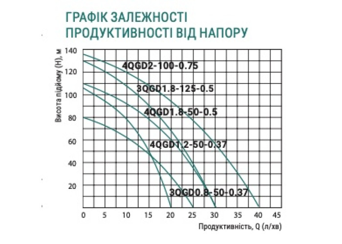 Н = 135 м, Q = 2,4 м3/год. (40 л/хв.), Р = 750 Вт, діаметр корпусу 96 мм, 1"