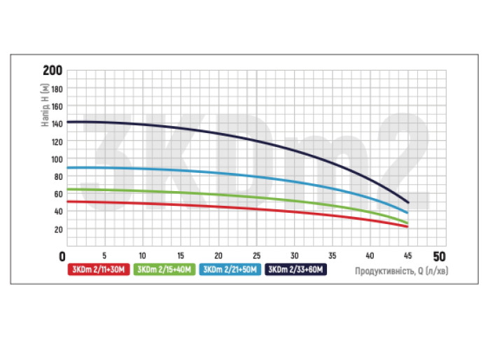 - У відцентровому насосі Koer 3KDm 2/33 кількість робочих коліс становить 33 шт. Ці колеса розташовані послідовно і забезпечують максимальну продуктивність насоса до 45 літрів на хвилину.