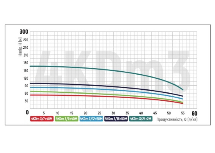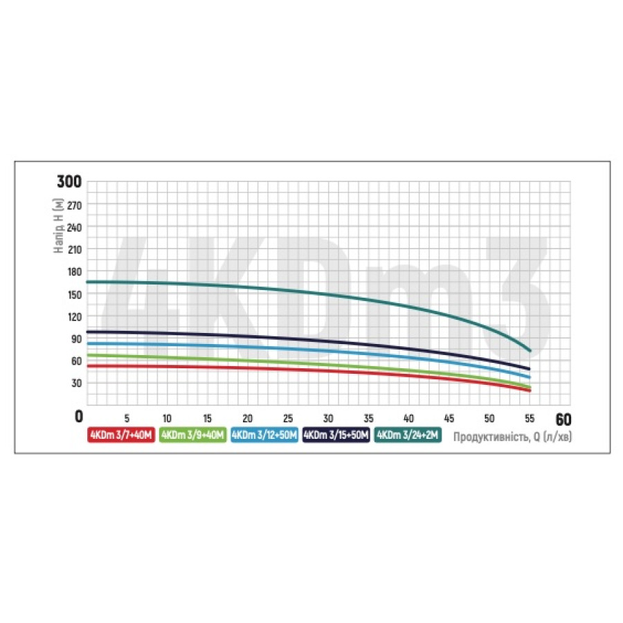 Н = 106 м, Q = 3,3 м3/год. (55 л/хв.), Р = 920 Вт, підключення 1¼”, кабель 50 м