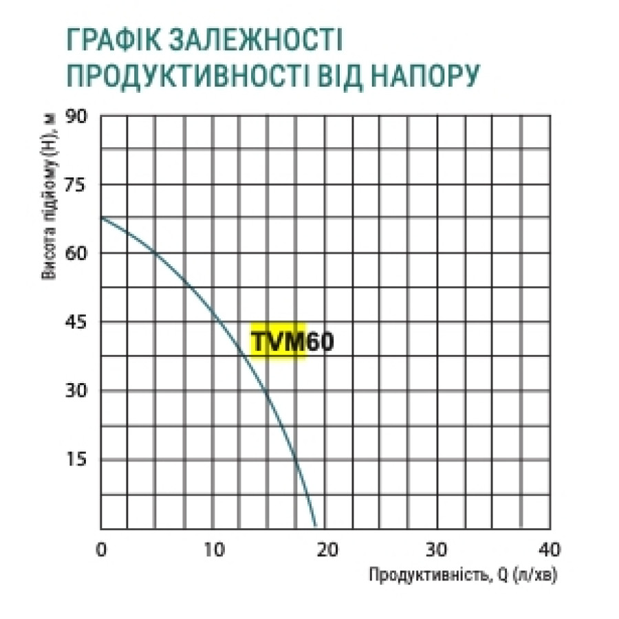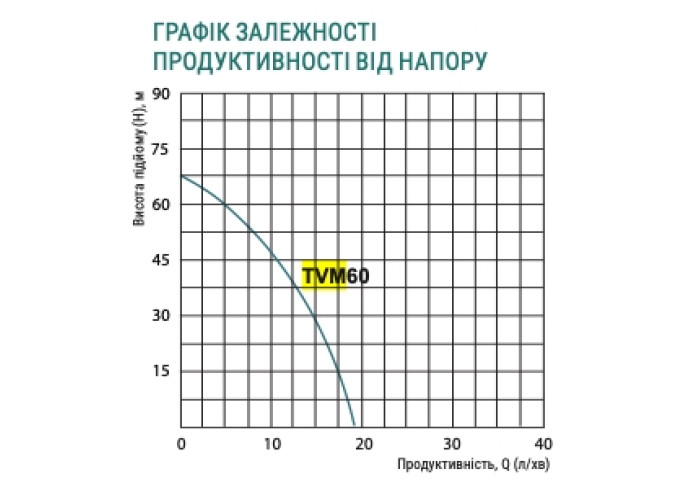 Верхній забір води, Н = 70 м, Q = 1,1 м3/год (18 л/хв.), Р = 250 Вт, глибина занурення до 3 м, під'єднання шлангове ½", кабель 20 м