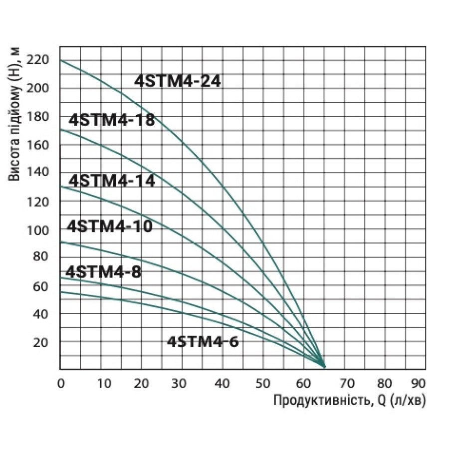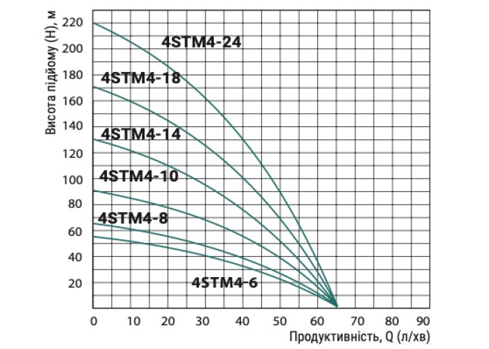 Н = 64 м, Q = 4 м3/год. (66 л/хв.), Р = 550 Вт, підключення 1¼”, кабель 25 м, пульт
