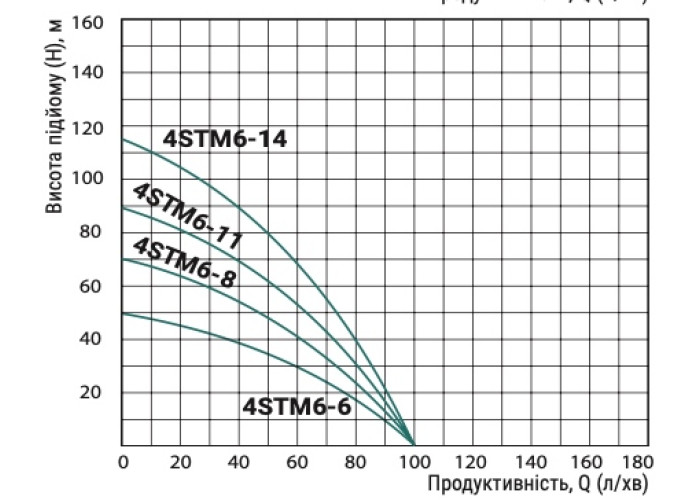 Н = 100 м, Q = 6 м3/год. (100 л/хв.), Р = 1100 Вт, підключення 1½”, кабель 35 м, пульт