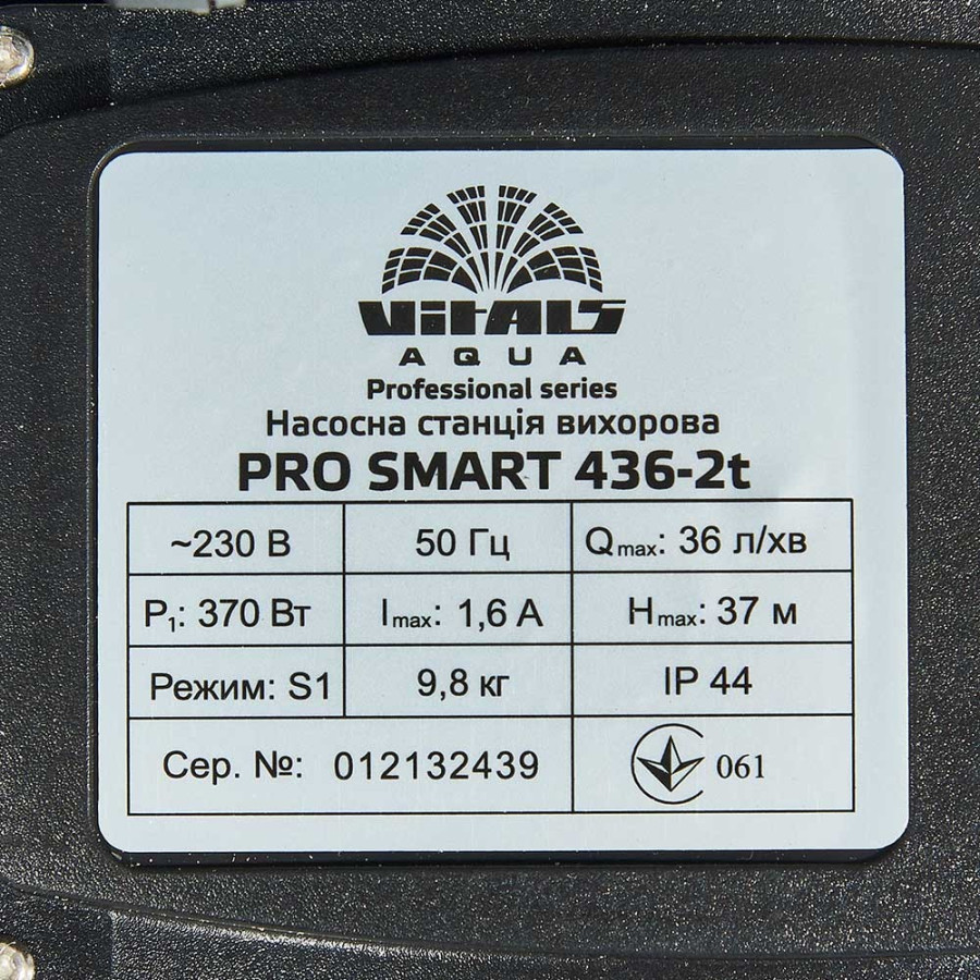 Станція оснащена консольним роторним вихровим самовсмоктуючим насосом серії PQ. Він стабільно працює за наявності у воді великої кількості бульбашок повітря. Станція Vitals Aqua PRO SMART 436-2t зазвичай застосовується, коли необхідно отримати великий напір при малому обсязі перекачування. Оснащена гідроакумулятором 2 л з еластичною мембраною, згладжує нерівномірності розбирання води, запобігає надто частим включенням і вимкненням насоса.