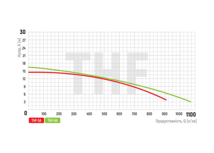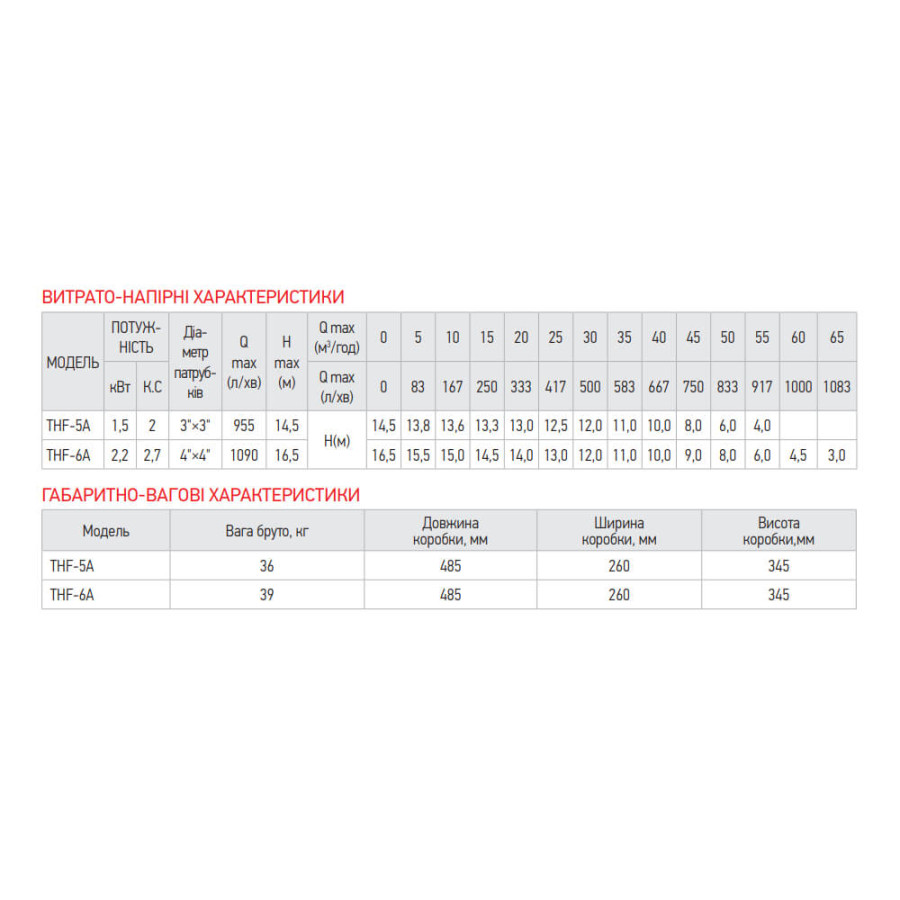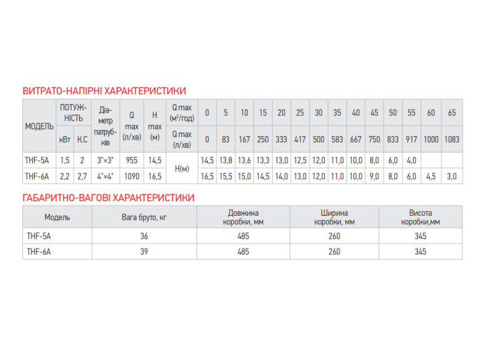 Н = 16,5 м, Q = 65,4 м3/год. (1090 л/хв.), Р = 2200 Вт, глибина всмоктування до 3 м, приєднання 4" × 4"