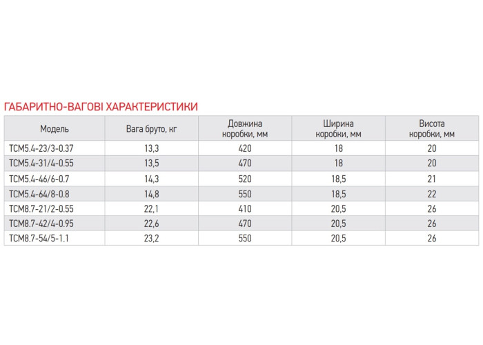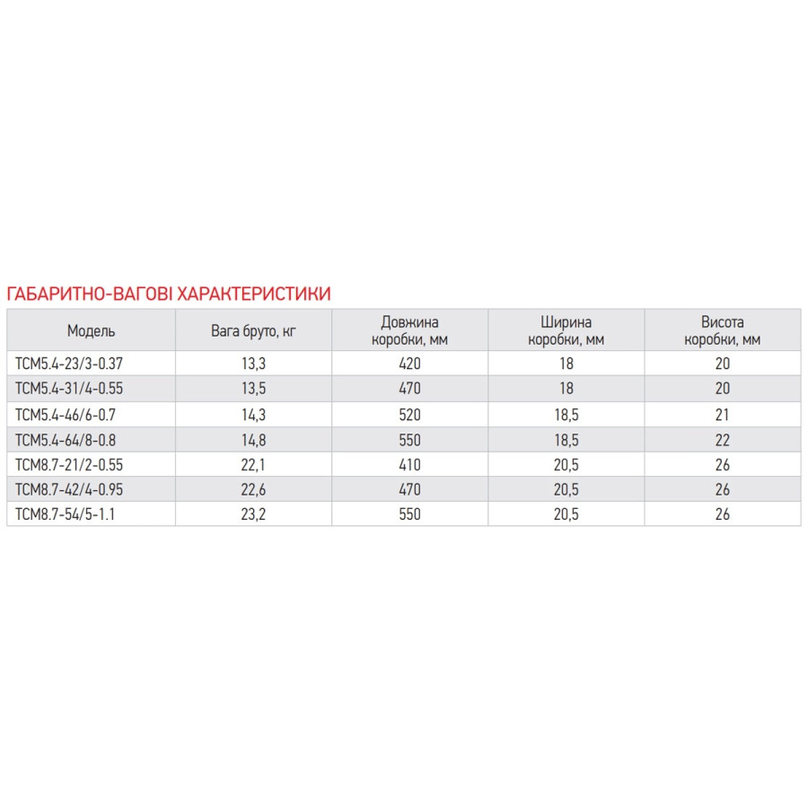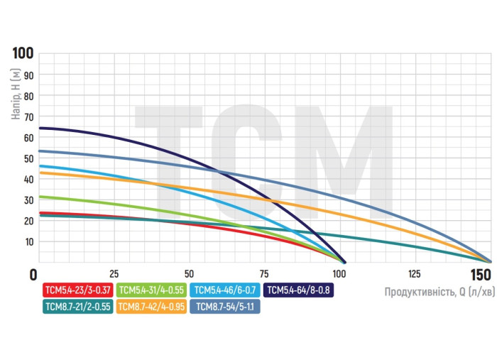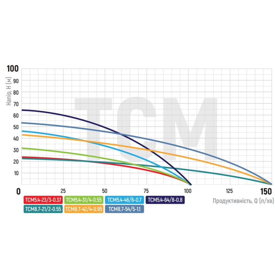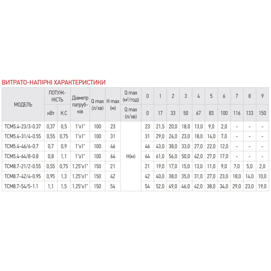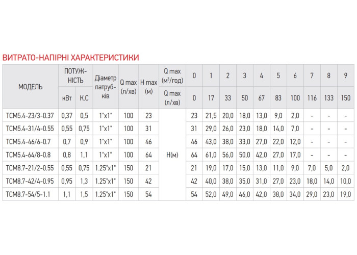 Н = 42 м, Q = 9 м3/год. (150 л/хв.), Р = 950 Вт, глибина всмоктування до 5 м, приєднання 1¼” × 1”
