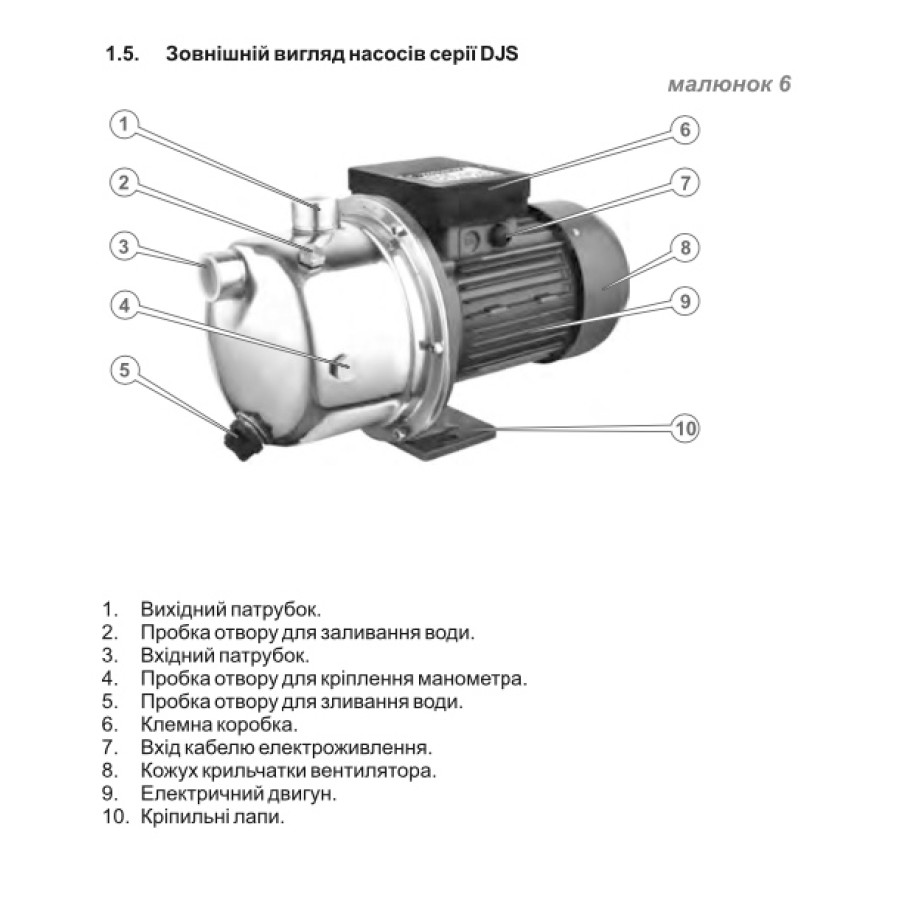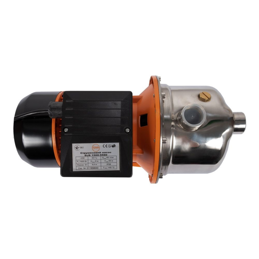 Н = 55 м, Q = 3,6 м3/год. (60 л/хв.), Р = 1500 Вт, глибина всмоктування до 8 м, підключення 1"×1"
