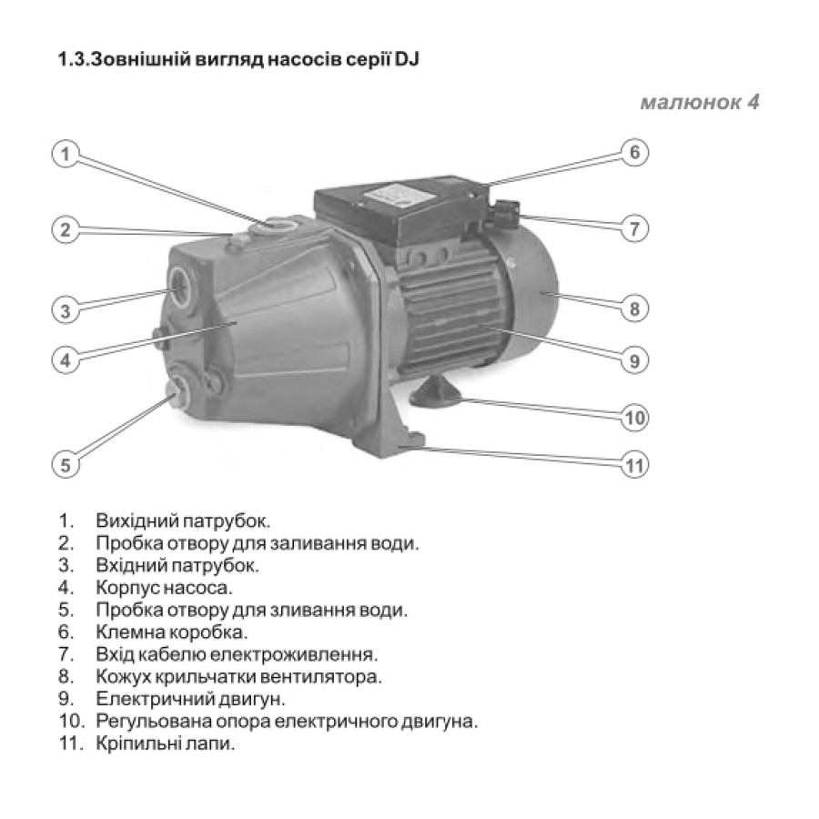 Н = 45 м, Q = 3,3 м3/год. (55 л/хв.), Р = 1100 Вт, глибина всмоктування до 8 м, підключення 1"×1"