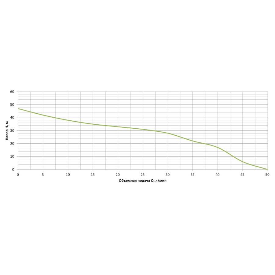 Н = 52 м, Q = 3,0 м3/год. (50 л/хв.), Р = 950 Вт, глибина всмоктування до 8 м, підключення 1"×1"