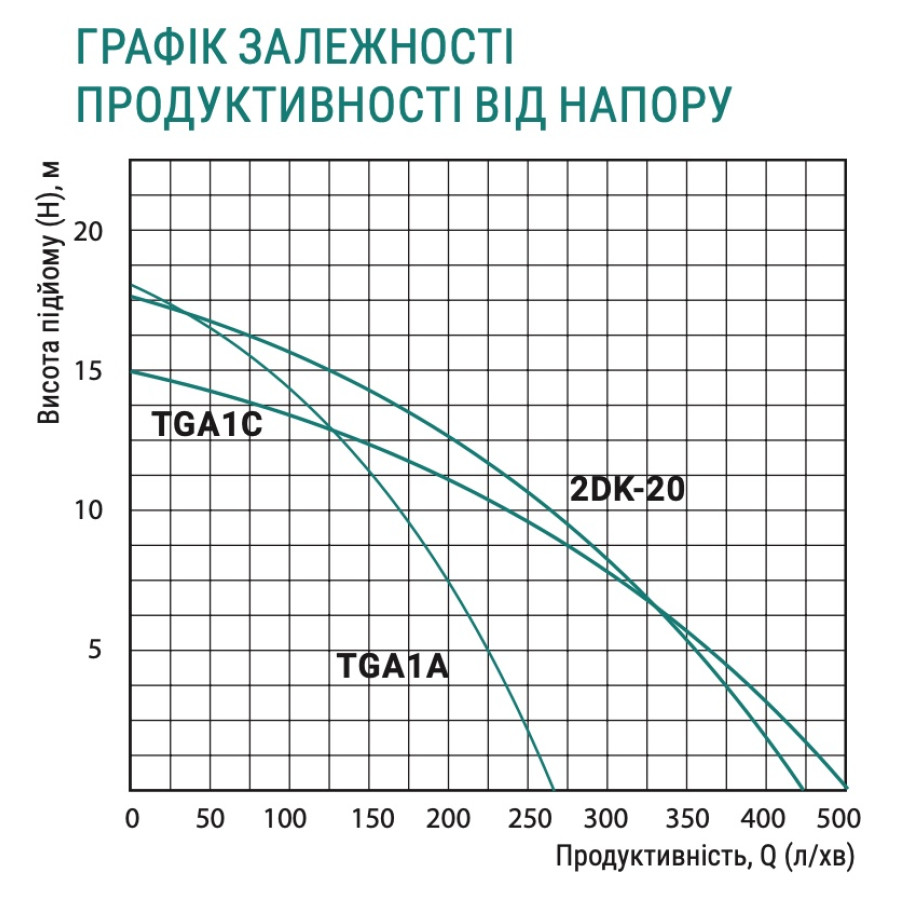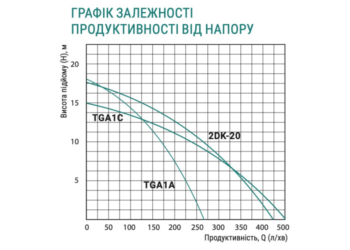 Н = 18 м, Q = 16 м3/год. (267 л/хв.), Р = 750 Вт, глибина всмоктування до 5 м, приєднання 1½” × 1½”