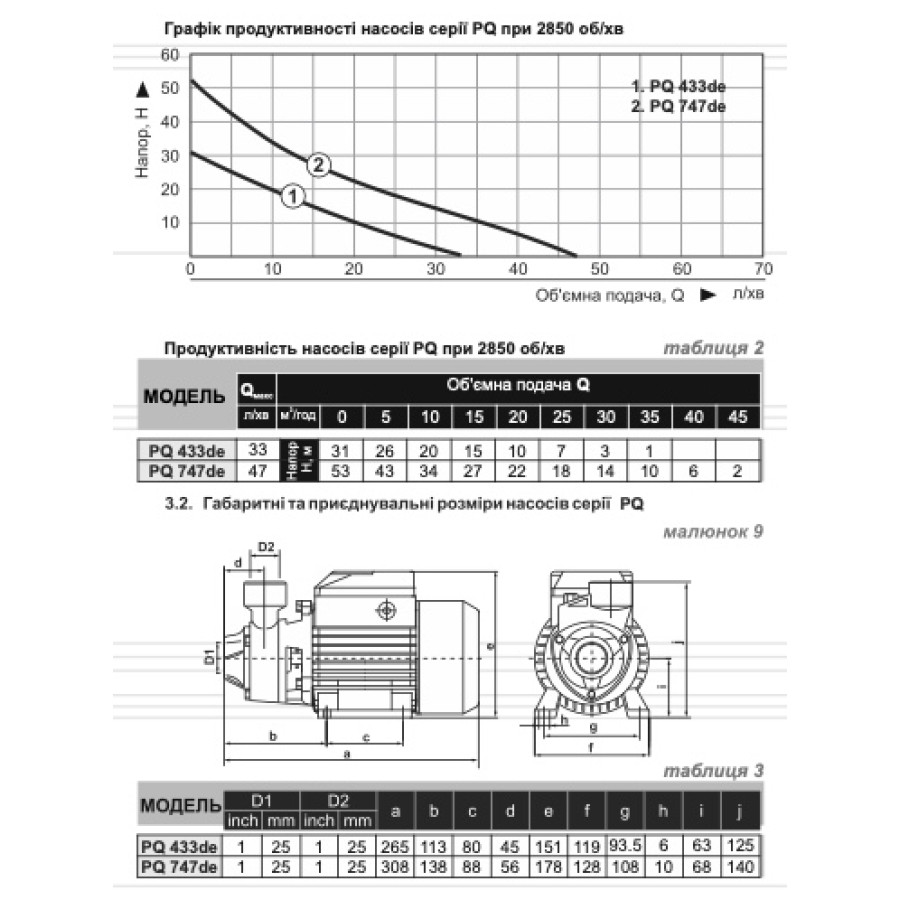 Н = 53 м, Q = 2,9 м3/год. (47 л/хв.), Р = 712 Вт, глибина всмоктування до 5 м, підключення 1"×1"