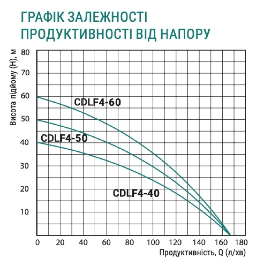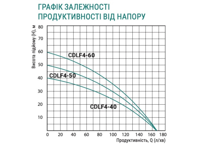 Н = 40 м, Q = 10,1 м3/год. (168 л/хв.), Р = 900 Вт, глибина всмоктування до 8 м, приєднання 1¼” × 1”