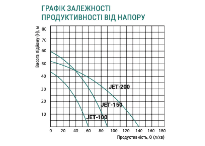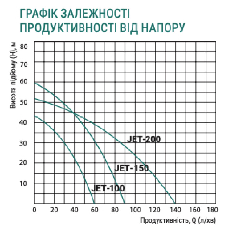 Н = 43 м, Q = 3,6 м3/год. (60 л/хв.), Р = 750 Вт, глибина всмоктування до 9 м, приєднання 1" × 1"