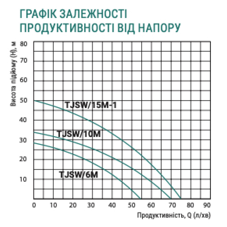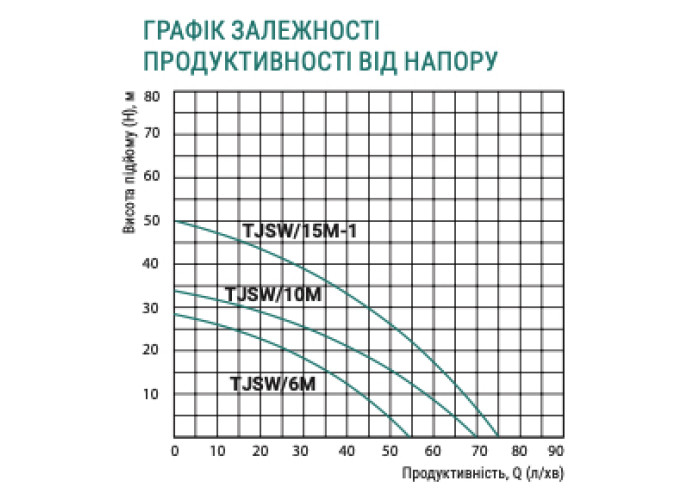 Н = 50 м, Q = 4,2 м3/год. (70 л/хв.), Р = 1100 Вт, глибина всмоктування до 9 м, приєднання 1" × 1"