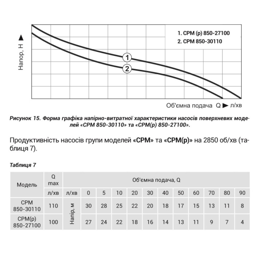 Н = 27 м, Q = 6 м3/год. (100 л/хв.), Р = 850 Вт, глибина всмоктування до 3 м, підключення 1"×1"