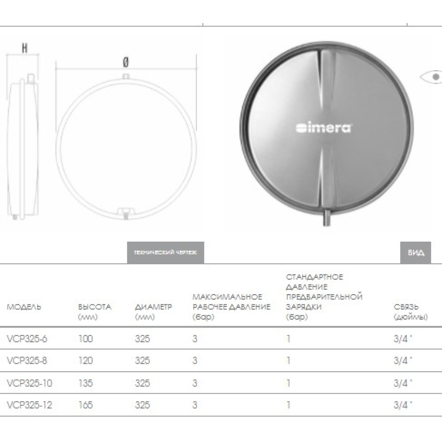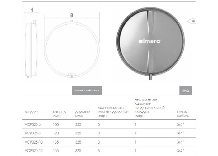 IMERA VCP 392-6 л – плоский круглий розширювальний бак (експанзомат) мембранного типу, призначений для компенсації зміни об'єму теплоносія при нагріві та розширенні теплоносія (води, або незамерзаючих рідин) у системах опалення закритого типу та підтримки в них робочого тиску. Баки цієї серії не призначені для питної води та водопостачання.