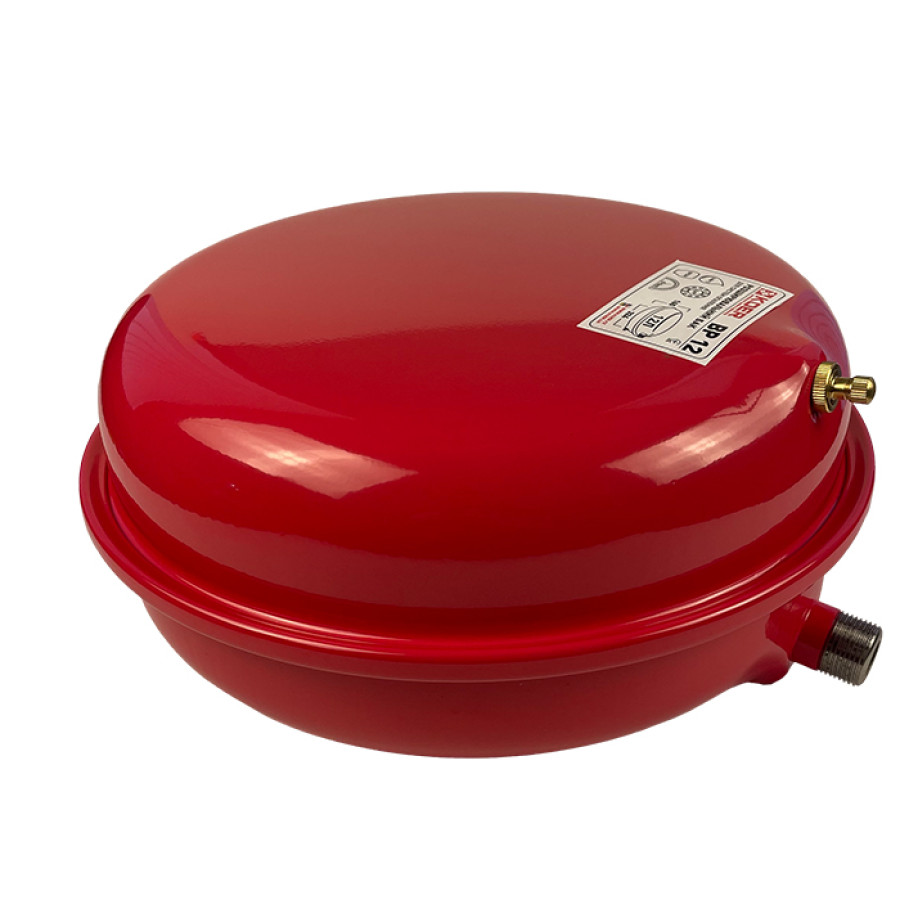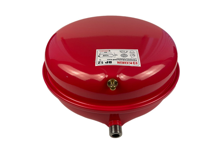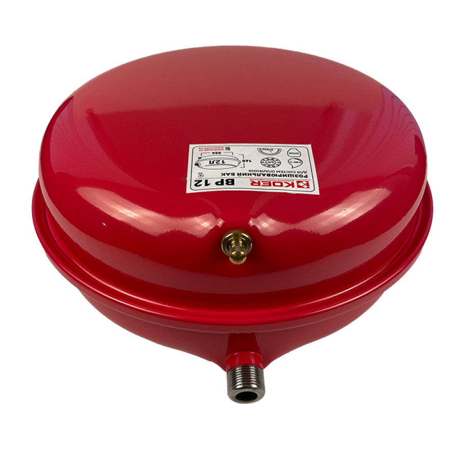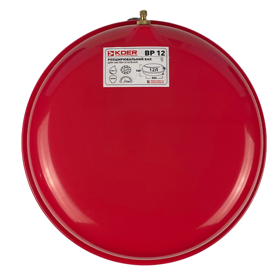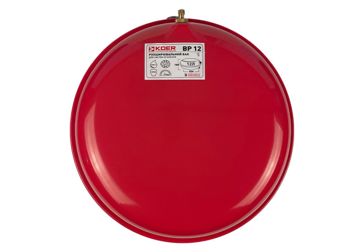 Розширювальний бачок KOER BP12 плоскої шайбоподібної форми, об'ємом 12 літрів призначений для компенсації тимчасового надлишкового тиску та розширення теплоносія в системах опалення закритого типу загальною ємністю до 120 л.
