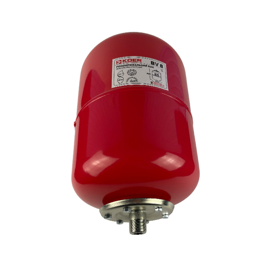 Круглий розширювальний бачок KOER BV8 об'ємом 8 літрів призначений для компенсації тимчасового надлишкового тиску та розширення теплоносія в системах опалення закритого типу загальною ємністю до 80 л