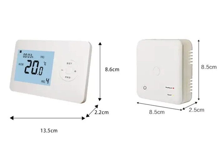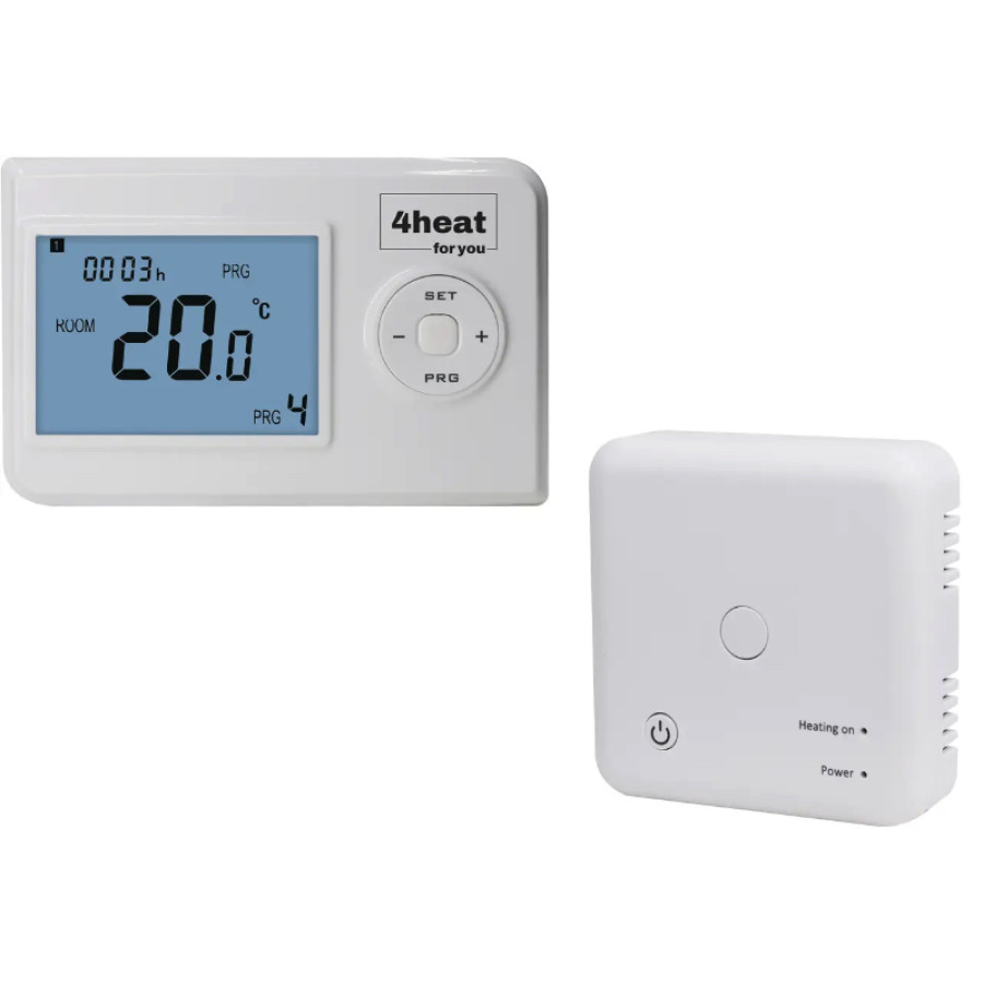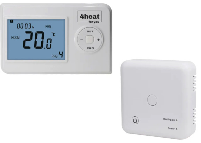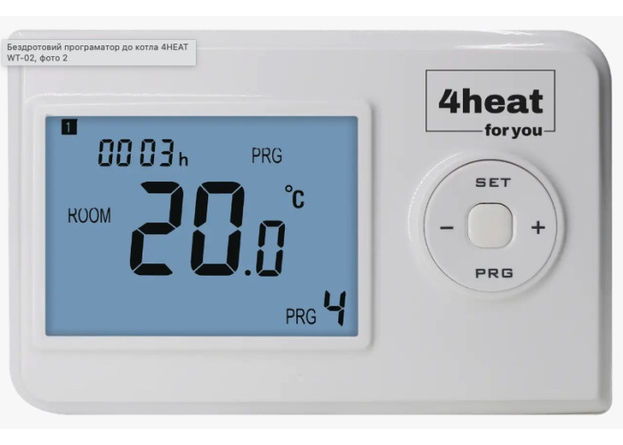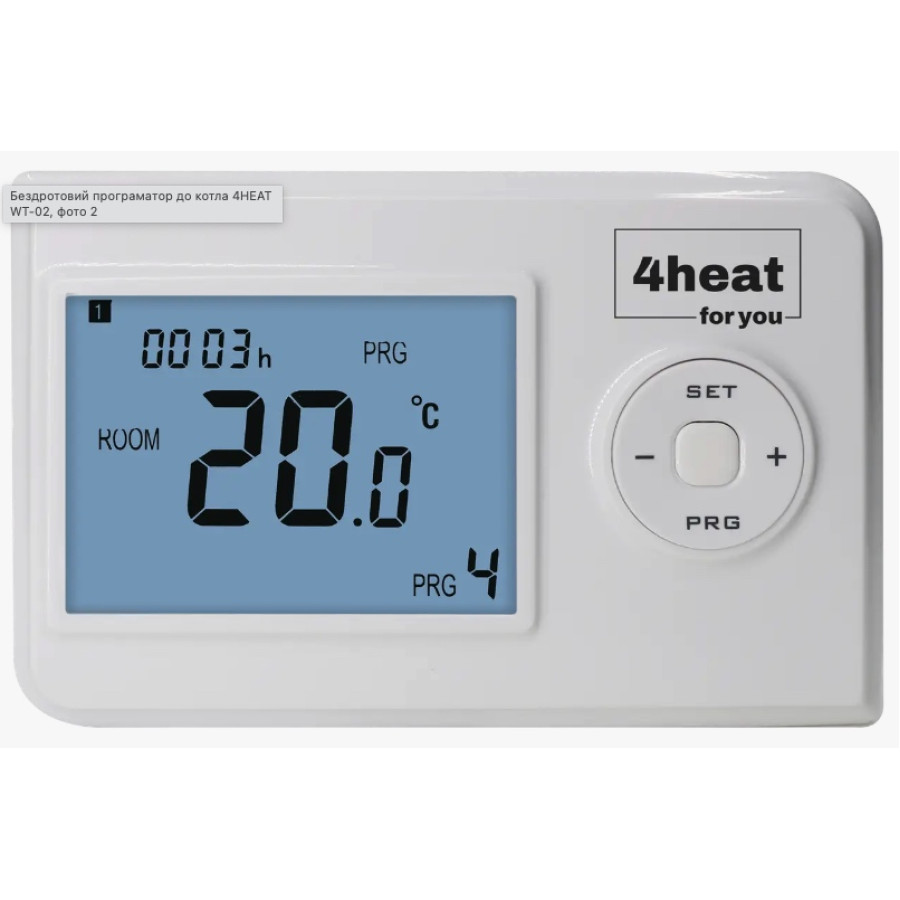 4HEAT WT-02 - це бездротова модифікація терморегулятора, яка передбачає наявність двох блоків у комплекті (приймач та бездротовий програматор). Блок приймача підключається до котла на безпотенційні клеми (зазначені в інструкції до котла). При цьому програматор виноситься в потрібну кімнату, де потрібно підтримувати необхідний температурний режим. Ця частина комплекту може встановлюватися на стіну, або ставитися на стіл за допомогою спеціальних кількох ніжок.