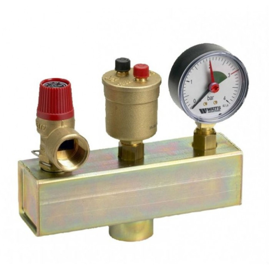 Група безпеки котла для захисту закритих систем опалення до 50 кВт. Включає в себе запобіжний клапан з порогом спрацьовування 3 бари, автоматичний (з запірним клапаном) MKV10R і манометр MHR6 3 / 4-3 / 8 ", встановлені на сталевий консолі (з гальванічним покриттям). Підключення 1" внутрішнє різьблення. {{1 }}