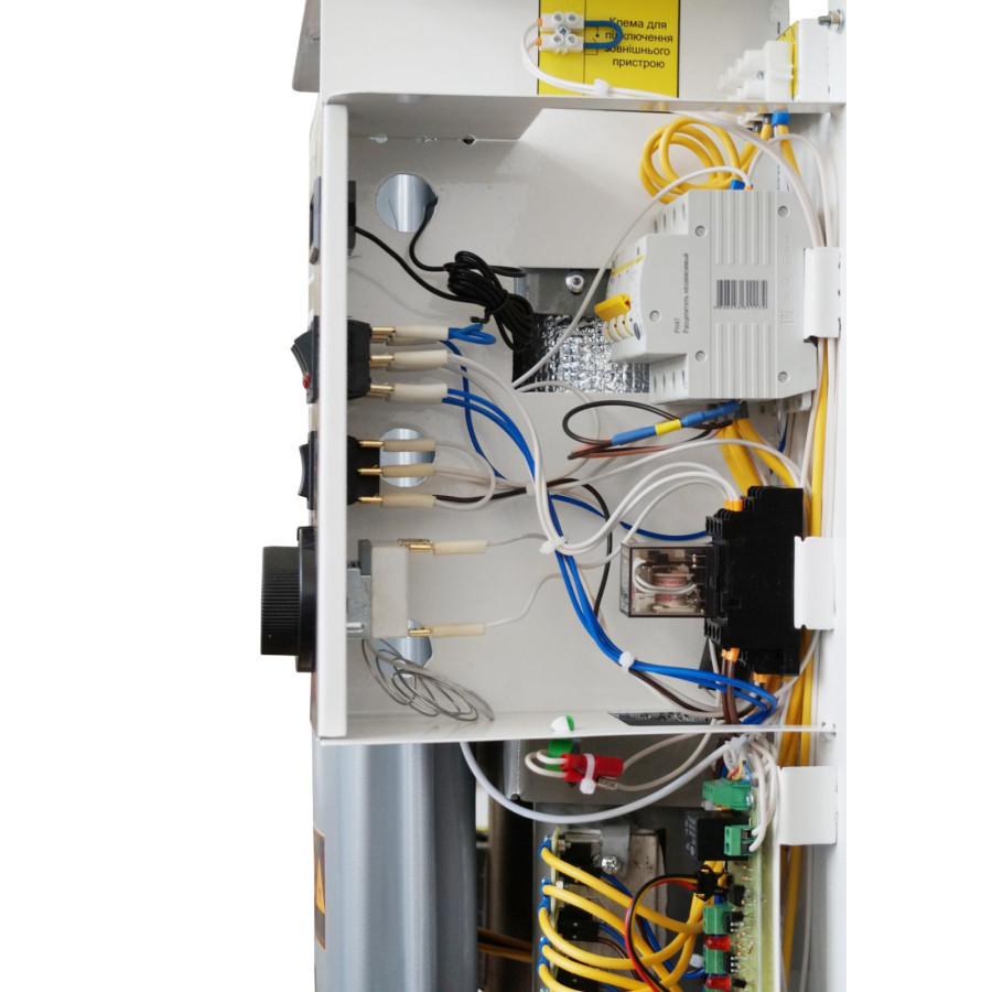 - Комутація котла побудована на сімісторних блоках, що забезпечують безшумність включення ТЕНів, без клацань, притаманних магнітним пускачам.