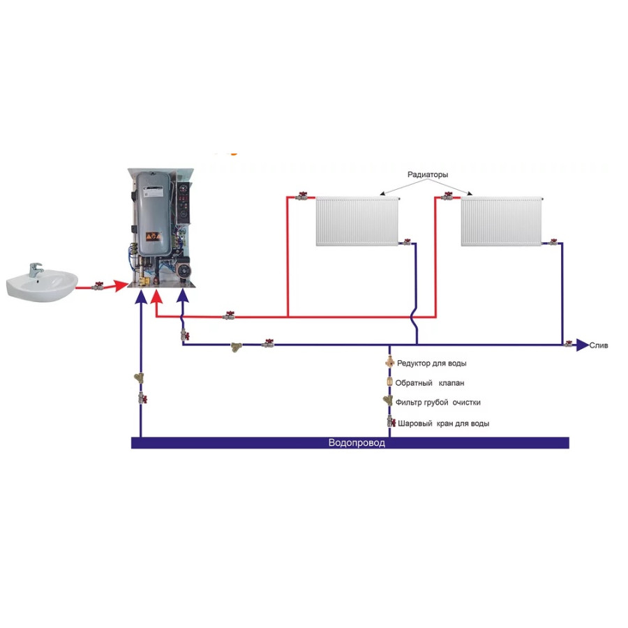 - Оснащений повною комплектацією, що необхідна для самостійної роботи в опалювальній системі.