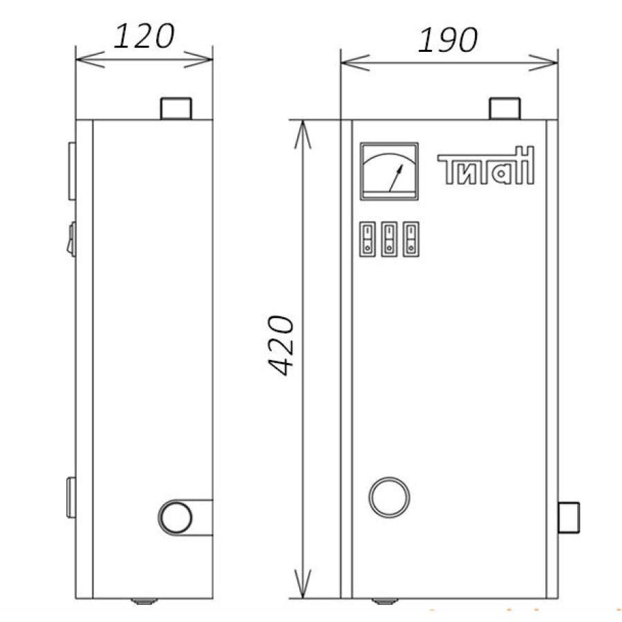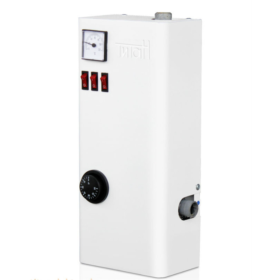 Електрокотел Титан мікро 6 кВт 380 В настінного типу, призначений для опалення приміщень до 60 кв.м з відкритими і закритими системами опалення. Потужність – 6 кВт, три ступені нагріву 2 – 4 – 6 кВт, управління режимом роботи за допомогою ручного термостата, без вбудованого насоса та розширювального бачка.