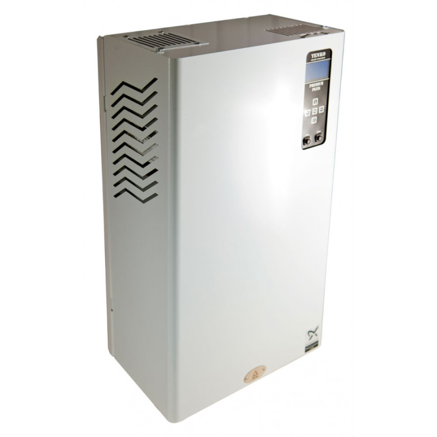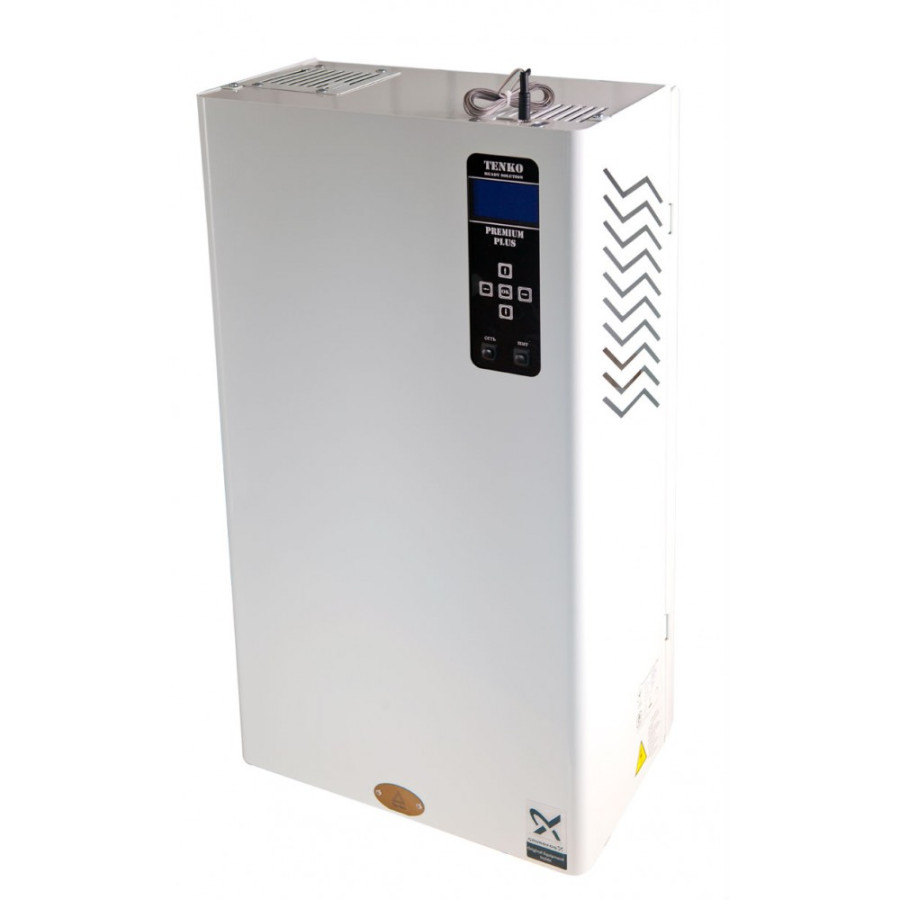 Електрокотел Tenko Premium Plus 12 кВт 380 В (ППKE_12) з програматором, насосом і бачком. Одноконтурний, настінного типу, призначений для опалення приміщень до 130 кв.м тільки з закритими системами опалення з тиском не менше, ніж 1 бар. Потужність автоматично модулюється від 4 до 12 кВт, режимом роботи управляє недельно-добовий програматор.