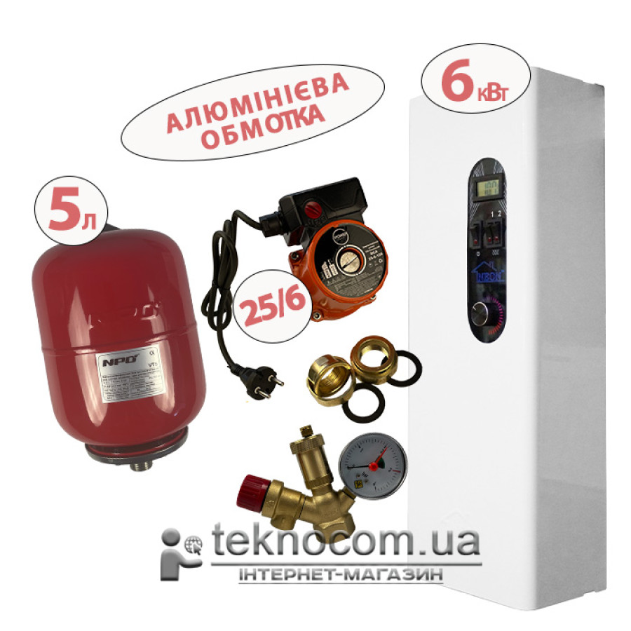 - Безшумний симісторний електрокотел без насоса Neon Classic 6 кВт 220/380 В (2 + 4 кВт), призначений для автономного опалення приватних будинків та невеликих громадських приміщень площею до 60 кв. м. Розрахований на роботу у відкритих та закритих системах опалення з примусовою циркуляцією теплоносія.Встановлюється як основне або резервне джерело опалення на додаток до газового або твердопаливного котла.