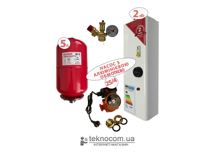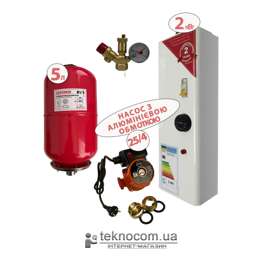 Сумарна ціна комплекту обійдеться вам дешевше на 15%, ніж купувати все окремо і на 60% дешевше, ніж коштує подібний котел із вбудованим насосом, розширювальним бачком та групою безпеки.