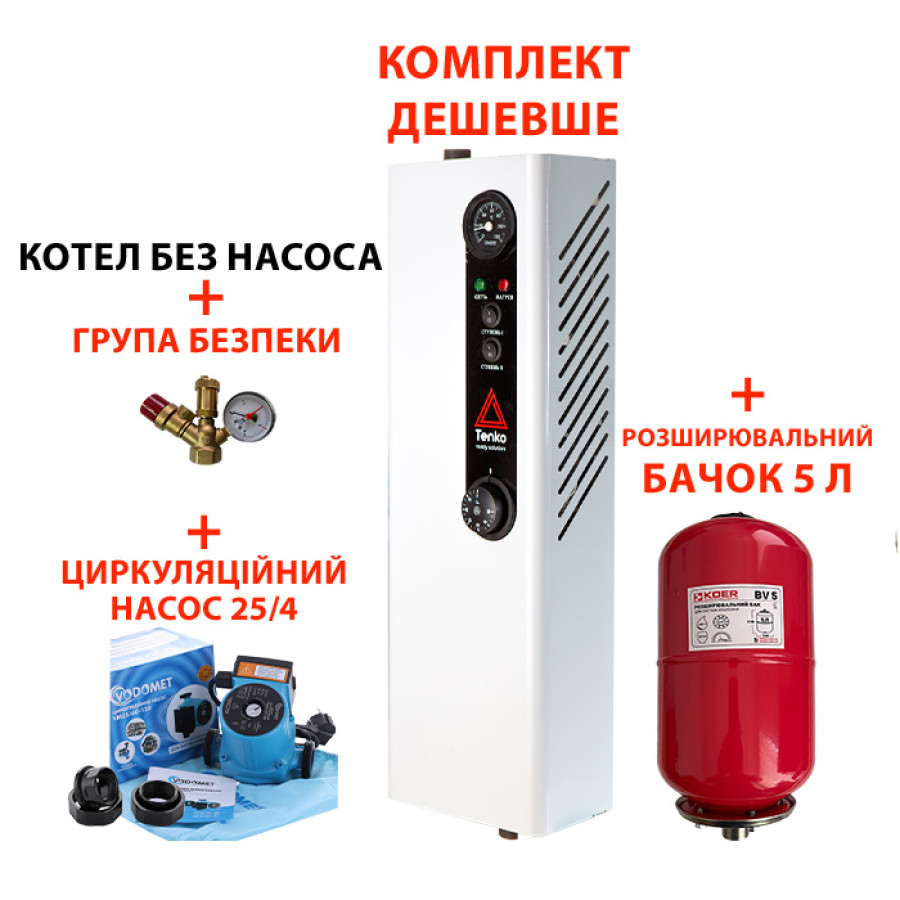 Сумарна ціна комплекту обійдеться вам дешевше на 15%, ніж купувати все окремо і на 60% дешевше, ніж коштує подібний котел із вбудованим насосом, розширювальним бачком та групою безпеки.