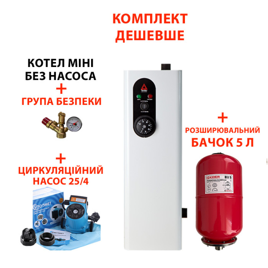 Сумарна ціна комплекту обійдеться вам дешевше на 15%, ніж купувати все окремо і на 60% дешевше, ніж коштує подібний котел із вбудованим насосом, розширювальним бачком та групою безпеки.