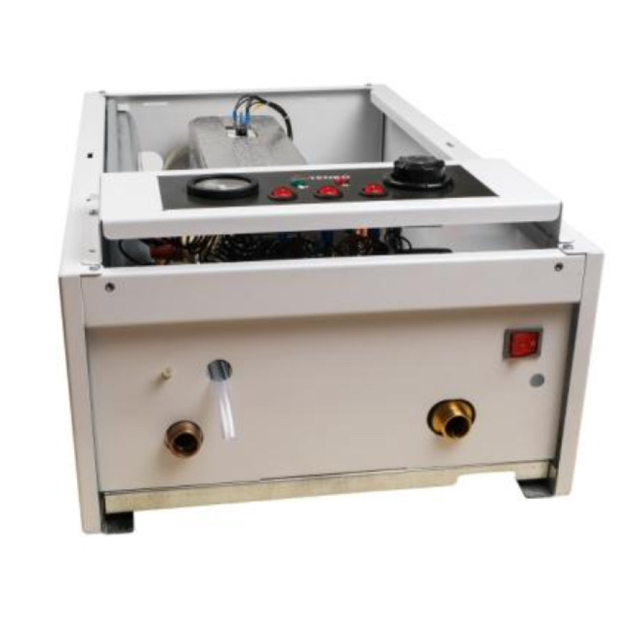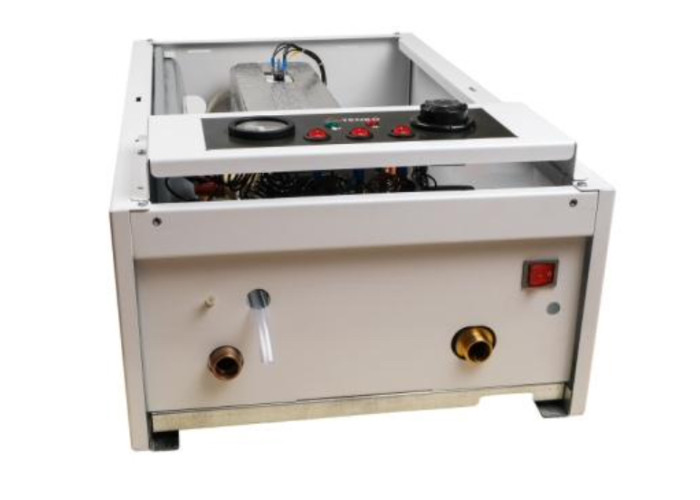 До подвійного теплообмінника вставлено два блоки тенів по 7,5 кВт кожний. Матеріал тенів – нержавіюча сталь.