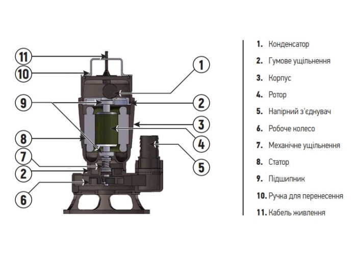 Н = 15 м, Q = 19,8 м3/ч (330 л/мин.), Р = 1500 Вт, глубина погружения до 5 м, с патрубком 2”, с фрезой