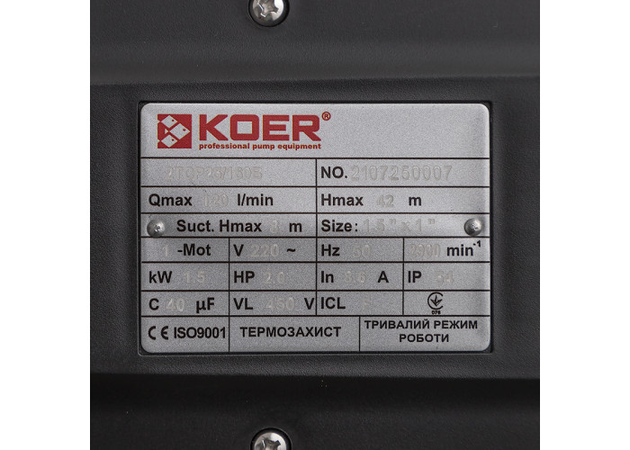 Н = 42 м, Q = 7,2 м3/ч (120 л/мин.), Р = 1500 Вт, глубина всасывания до 3 м, подсоединения 1½” × 1”