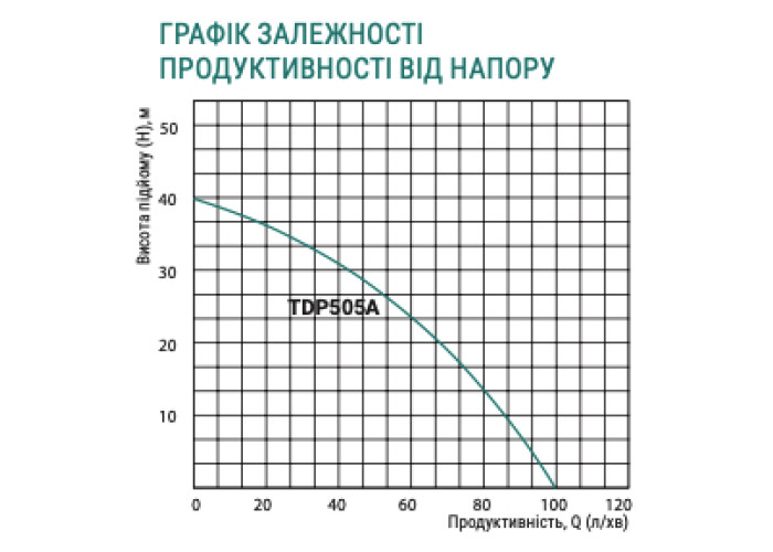 Н = 40 м, Q = 6 м3/ч (100 л/мин.), Р = 1100 Вт, глубина всасывания до 30 м, подсоединения 1" × 1"