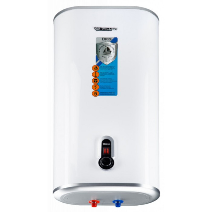 Willer IV50DR Brig - плоский электрический водонагреватель с внутренним баком из нержавеющей стали AISI316 (отличается более высокой антикоррозионной стойкостью в сравнении с распространённой AISI304). Минимальная глубина изделия (260-295мм с учётом монтажных планок) позволит установить бойлер даже в стеснённых пространством условиях. В бойлере Willer IV50DR Brig установлены два сухих нагревательных элемента мощностью 1000 Вт каждый. Нагревательные элементы расположены в специальных защитных кожухах (фланцах) и непосредственно не контактируют с водой, что значительно увеличивает их долговечность и экономичность.