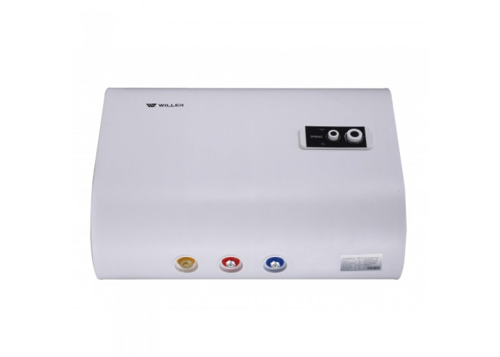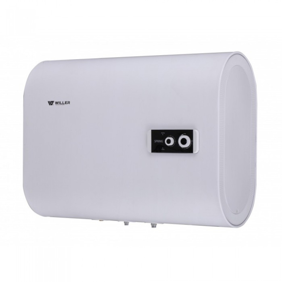 Горизонтальний тонкий міні електричний бойлер Willer EH60R Spring - нагрівач води накопичувального типу ємністю 60 л. Установка на стіну горизонтально, що важливо при нестачі простору в приміщенні і особливості інтер'єру.
