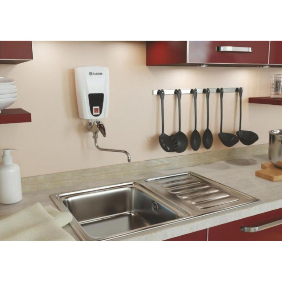 Водонагрівач електричний проточного типу ELDOM 6500 W з краном створений для нагріву проточної води для господарських та санітарних потреб. Модель розрахована на одночасний розбір води в одній точці умивальника або кухонного миття.